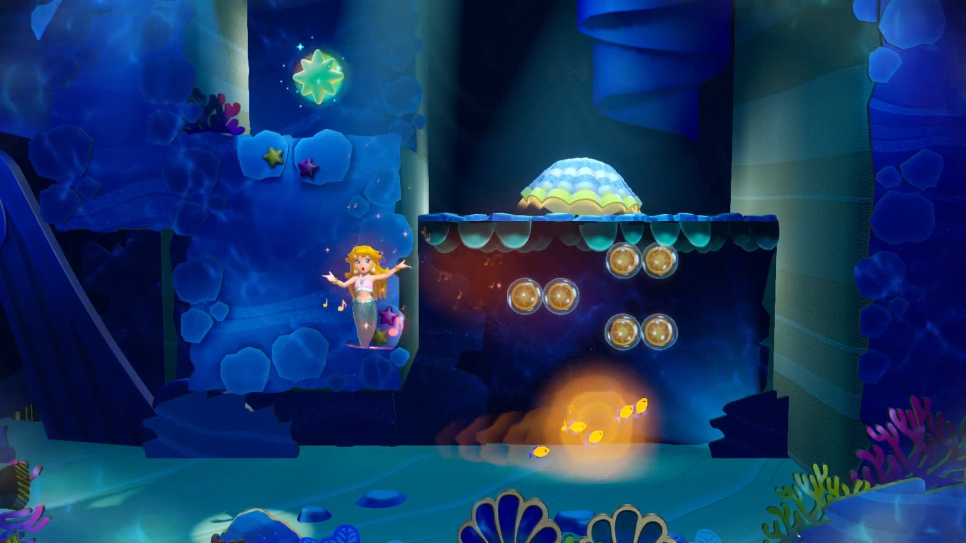 - Peach Sirena: con la sua voce può controllare i banchi di pesci, intonando melodie che le permettono di risolvere enigmi e rivelare percorsi;