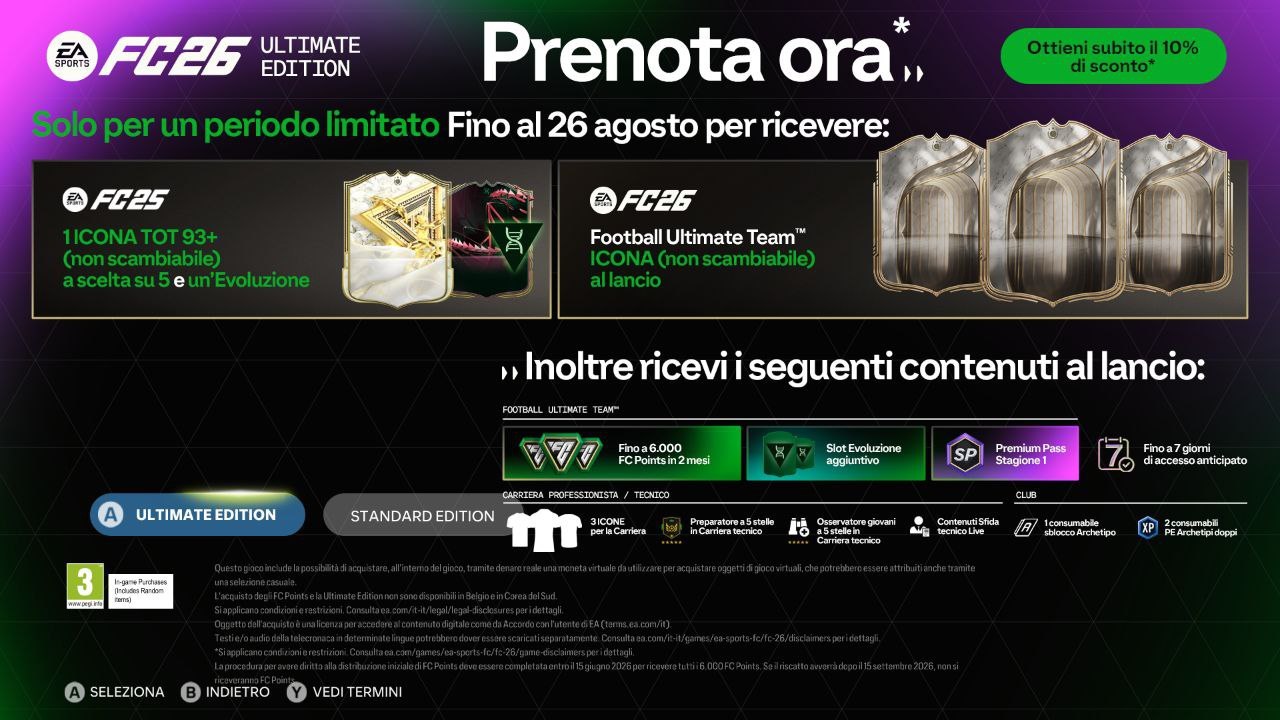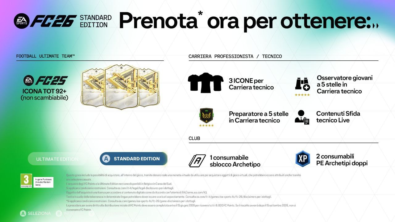 Tutto ciò sarà presente oltre ai medesimi bonus dell’edizione standard. Anche in questo caso EA non si scorda di EA SPORTS FC 25 e regala, col preordine, un’Icona TOT 93+ non scambiabile a scelta su 5 e un’evoluzione che aumenta gli attributi di tiro di qualsiasi giocatore a 99.