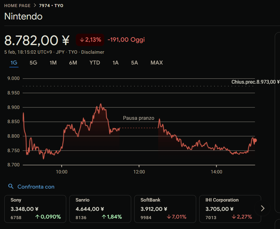 Al momento la console ha raggiunto quota 17,38 milioni di unità vendute, ma il valore delle azioni ha subito un brusco calo, passando dai precedenti 10.180 yen a 8.973 yen nel giorno 4 febbraio 2026, pari a una flessione dell’11%, e scendendo a 8.782 yen nella data odierna, 5 febbraio 2026. Un dato che ha inevitabilmente allarmato gli investitori, preoccupati sia dall’aumento dei costi dei componenti, sia dalla riservatezza dei vertici Nintendo, che limita la visibilità sui piani futuri e lascia poco margine di manovra agli sviluppatori.