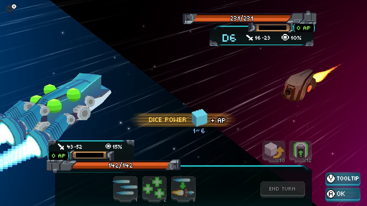 I combattimenti sono a turni, quindi dovremo, a ogni nostra data occasione, tirare un dado per ottenere un certo quantitativo di energia, chiamata AP nel gioco. Questa energia può essere utilizzata per eseguire certe azioni, ed ogni azione avrà un costo che aumenterà dopo un uso e si resetterà alla fine del turno. Ci sono diverse strategie che possiamo attuare durante questo tipo di battaglia: possiamo scegliere di conservare la nostra energia, per poi averne molta e scagliare un attacco potente a raffica, oppure concentrarci sull’attacco e quindi sparare a ogni occasione, o ancora possiamo cercare di bilanciare la riparazione della nostra navicella, rigenerando gli HP persi, e al contempo attaccare il nemico.
