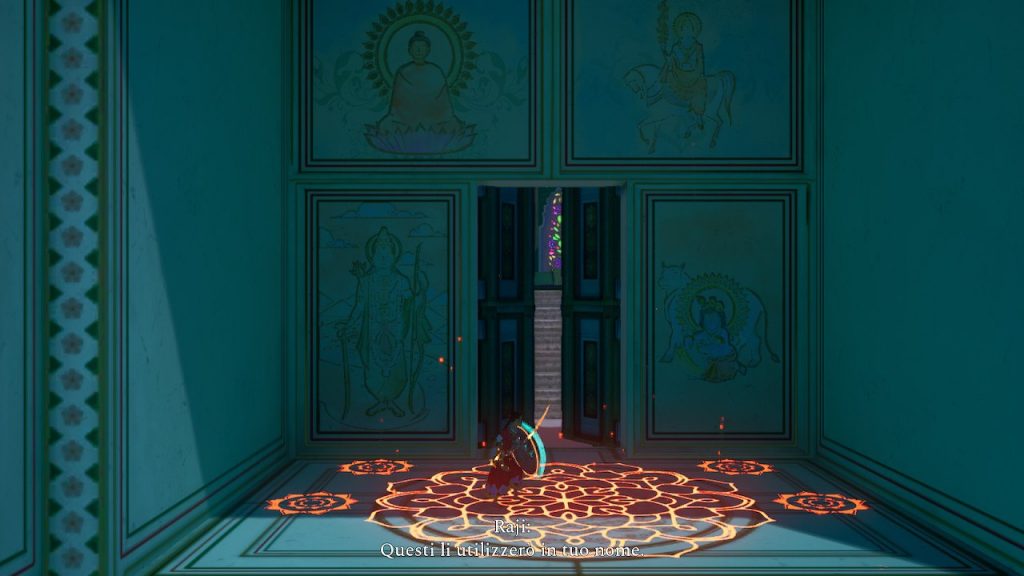 Disseminate per tutto il corso del viaggio, in effetti, variopinte pareti in stile pahari parleranno al fruitore del titolo, illustrandogli con esattezza e in dettaglio la storia di ogni divinità e entità che popola la religione indù. Risulta, dunque, quasi un peccato l’impossibilità di poter regolare la visuale, che viene spostata automaticamente a seconda del procedere di Raji.