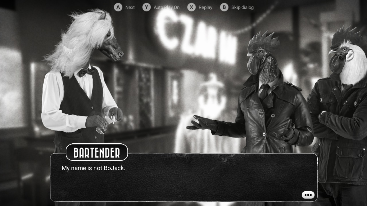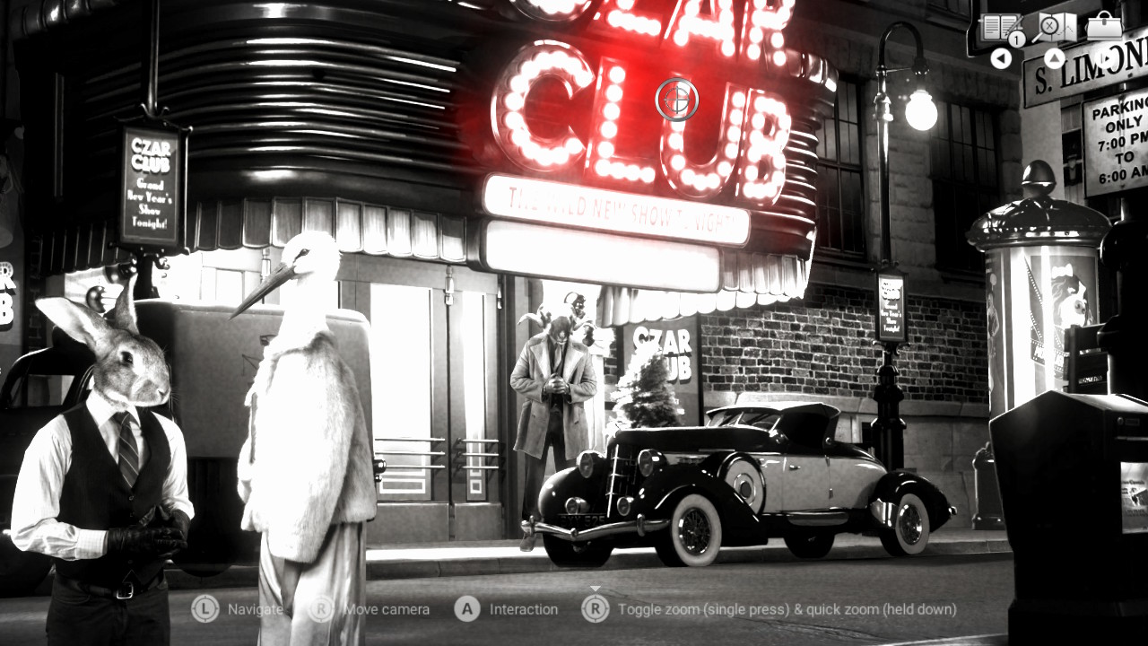 La musica jazz che ci guida in ogni nostra azione ci da la sensazione di sentire l’odore del tabacco che brucia, teletrasportando il nostro cervello in un’altra epoca. La grafica realistica delle location è quasi fotografica, e rispecchia a pieno lo stile e gli usi di quegli anni. Infine la scelta di utilizzare corpi umani con teste di animale rende tragicomico ogni scambio di battute, caratterizzando ogni soggetto in base all’animale e al ruolo del personaggio.