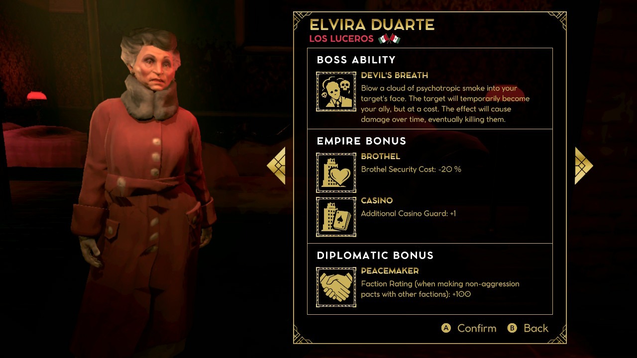 Avremo la possibilità di scegliere tra 13 differenti personaggi con i quali iniziare ad avviare il nostro giro d’affari. Ognuno di loro avrà delle peculiarità, dei vantaggi su determinati racket e delle abilità differenti. I protagonisti sono preconfezionati e la libertà di personalizzazione è limitata spesso all’arma che utilizzano, ma va bene così, non è questo il fulcro di Empire of Sin.