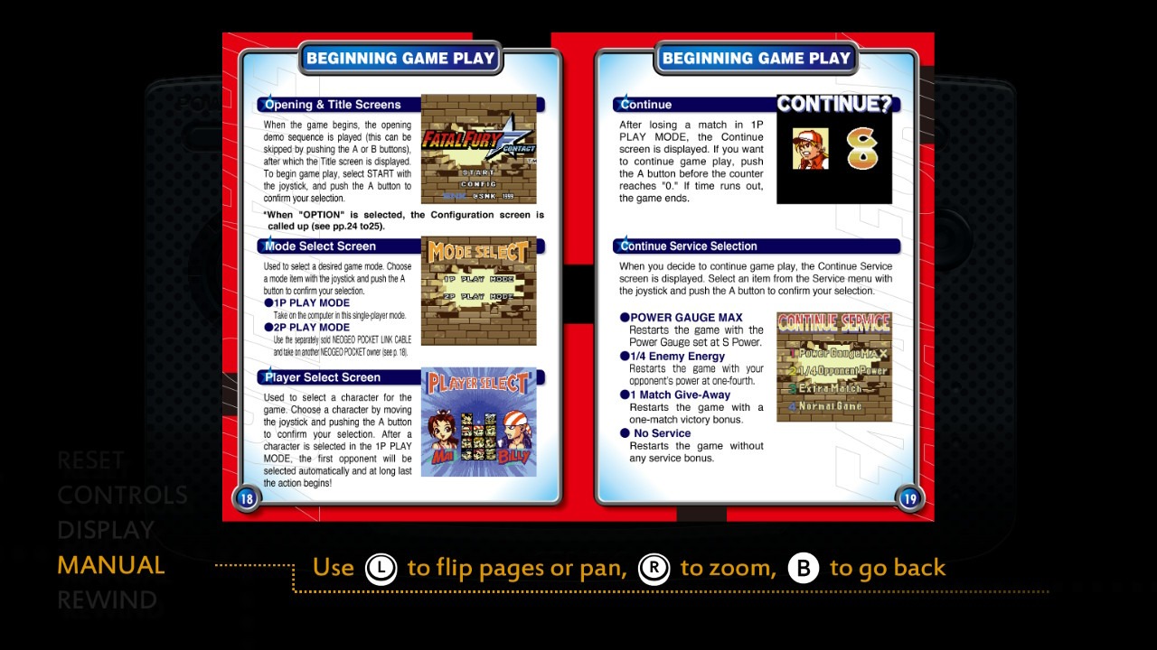 Oltre al classico setup con i Joy-Con scollegati e condivisione dello stesso schermo, quando selezioneremo la modalità a due giocatori compariranno due NeoGeo Pocket Color, dandoci la possibilità di giocare sullo stesso schermo ma ognuno nella sua metà. Inoltre è anche possibile ingrandire l’immagine avvicinando virtualmente la piccola console, che è completamente personalizzabile con skin preconfezionate.