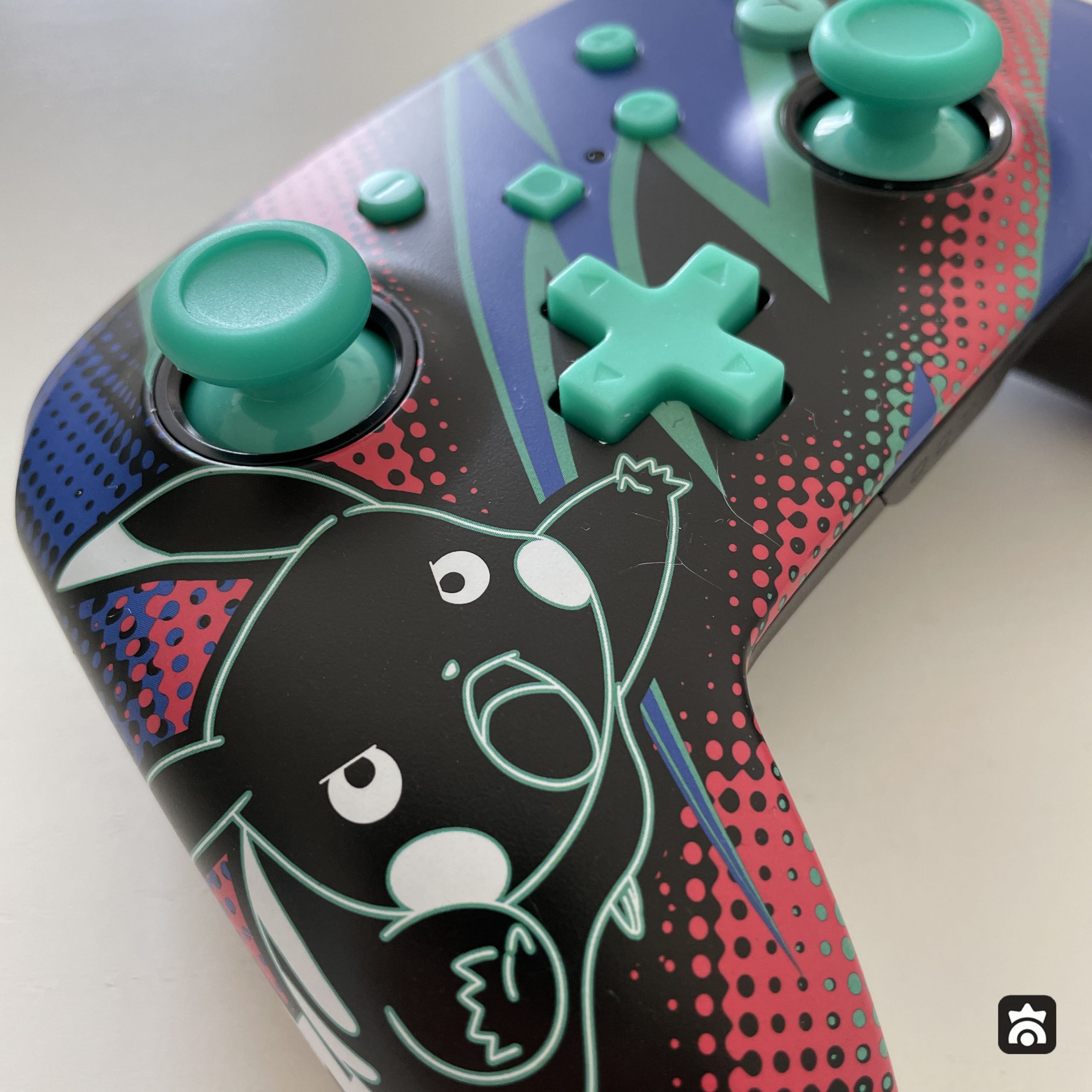 Per quanto quasi psichedelica e piena di forza, la pellicola superiore è abbastanza delicata e rischia di graffiarsi facilmente, infatti purtroppo il prodotto ci è arrivato con dei segni bianchi che sono evidenti anche dalle foto e saltano velocemente all’occhio, rovinando l’effetto scenico del disegno. Molto peculiare è anche il colore verde chiaro, ovviamente neon, dei tasti e degli analogici, che si amalgamano alla perfezione con la palette scelta da PowerA.