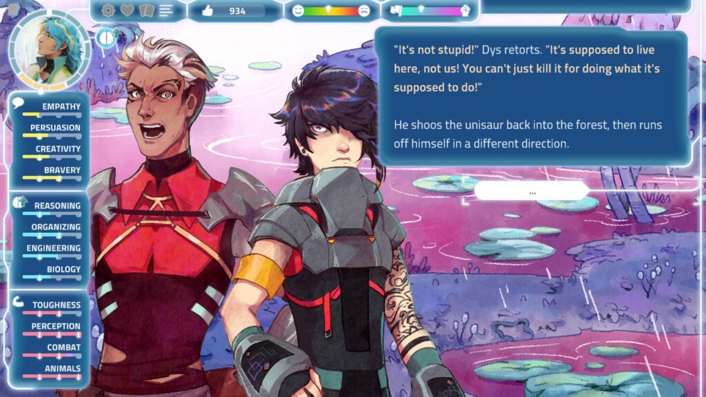 Questa trovata è ottima per giustificare la rigiocabilità di I Was a Teenage Exocolonist perché ogni run non è fine a sé stessa, ma si concatena alle successive: terminata la nostra “prima vita” infatti avremo nuove opzioni nella seguente! Queste saranno contraddistinte da un’icona a forma di vortice viola e saranno le scelte più determinanti nelle run successive alla prima, permettendoci di salvare alcuni personaggi e rimescolare le carte in tavola.