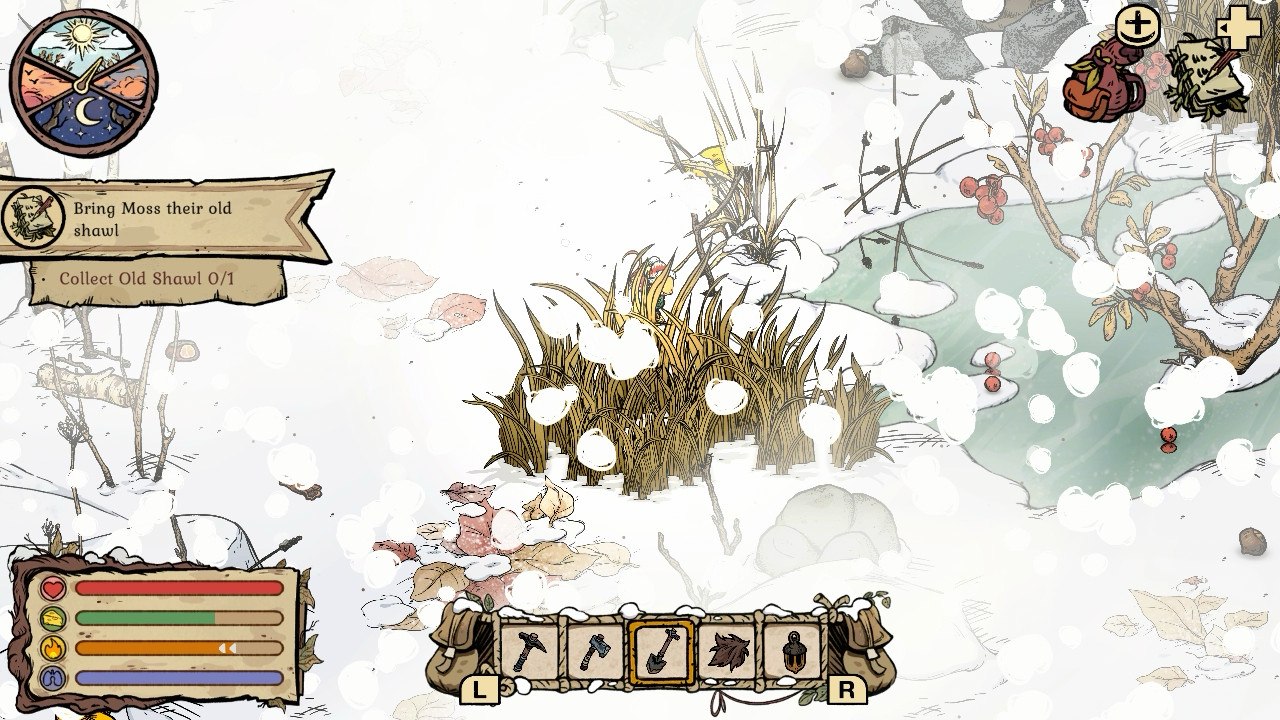 Il gameplay appare così intuitivo nella gestione della parte di sopravvivenza: raccogliere le risorse attraverso le fasi della giornata sarà importantissimo per sistemare casa, creare oggetti per alcune missioni, cucire nuovi vestiti, che ci scalderanno durante le escursioni, e cucinare cibi caldi, per recuperare energia e calore. Il titolo presenta infatti le quattro barre tipiche del suo genere, salute, fame, calore e stamina, che, superati i primi minuti di gioco, non spaventeranno più data la possibilità di ricaricarle molto facilmente con cibi e bevande.