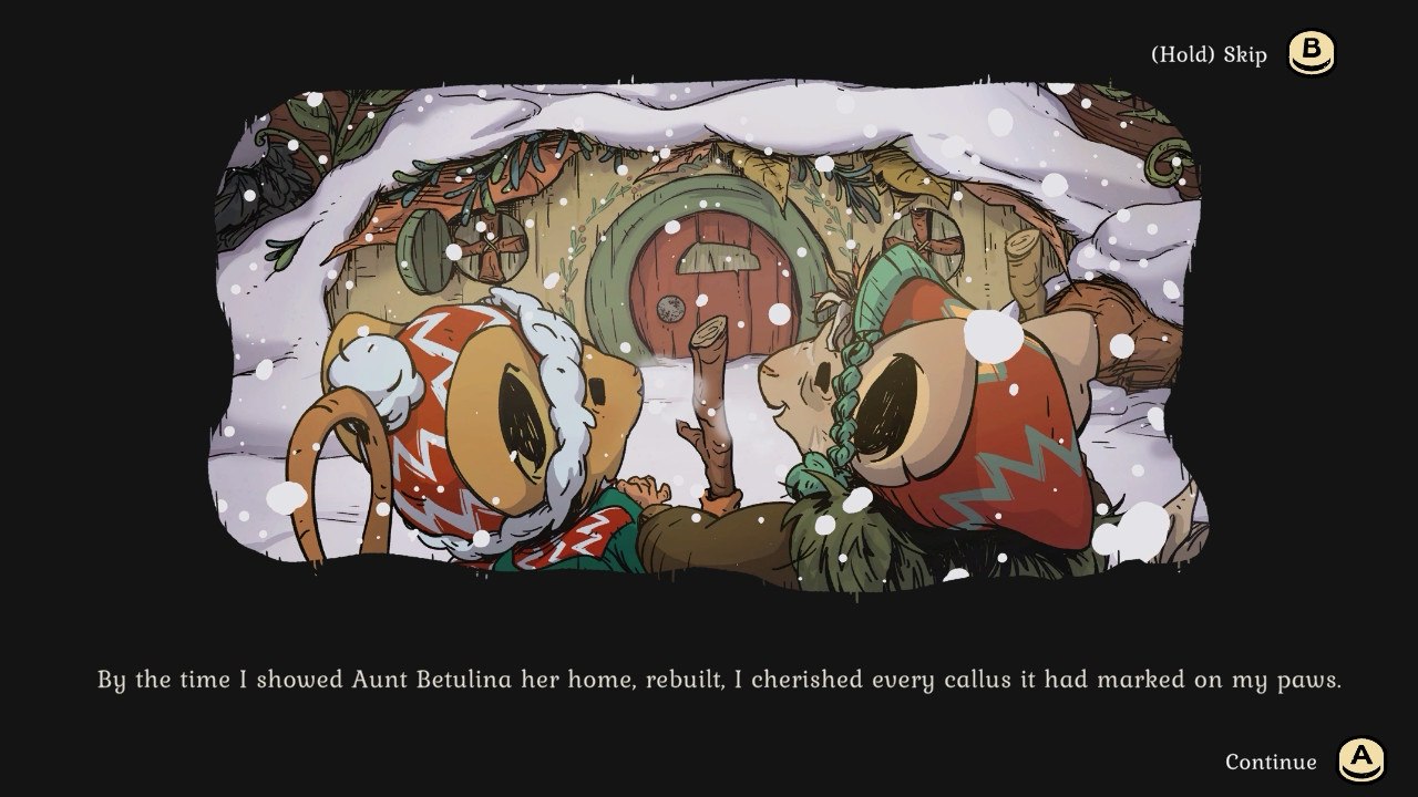 Winter Burrow è sicuramente un primo progetto ben riuscito, arricchito da un comparto artistico-musicale ben curato, personaggi visivamente deliziosi e temi delicati trattati con cura, ma che non è esimio da sviste tecniche e da una fondamentale ripetitività delle meccaniche.