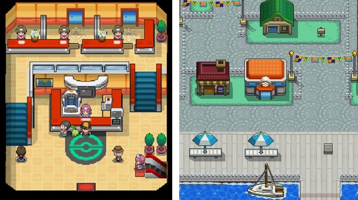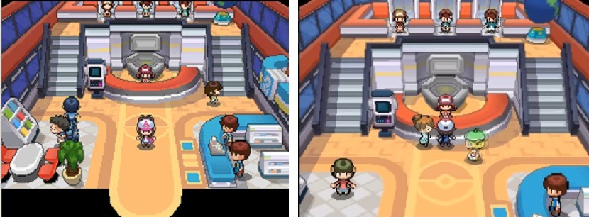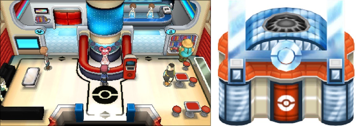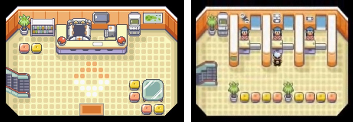 La quinta generazione ci regala due coppie di giochi, Pokémon Versione Bianca/Versione Nera e Pokémon Versione Bianca 2/Versione Nera 2, entrambe ambientate nella regione di Unima. Il Centro Pokémon di questa regione riprende alcuni aspetti passati ma ne introduce altrettanti di nuovi. Non appena varchiamo l’ingresso possiamo notare come il soppalco presente nei remake di Johto sia stato riproposto.