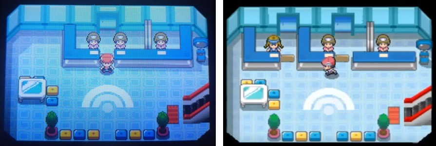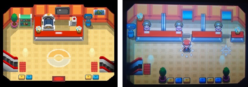 Subito davanti all’ingresso troviamo l’immancabile infermiera con la macchina curatrice, diventata ancora più grande e con un uno schermo enorme che mostra i Pokémon che vengono curati. Alla sua destra troviamo il PC e più in fondo il Pokémon Market, introdotto nella generazione precedente. Ma la vera novità si trova in fondo, alla sinistra del bancone. Qua possiamo infatti trovare un camerino, che ci consente di cambiare abiti o di provare diverse lenti a contatto per modificare l’aspetto del nostro Allenatore.