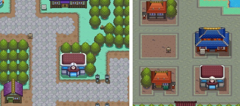 L’esterno si presenta con l’ormai consolidato tetto rosso, al centro del quale troviamo l’icona di una Poké Ball. Anche la porta a vetri scorrevole viene riproposta. Sebbene non sia presente la grande varietà degli esterni di seconda generazione, troviamo due Centri Pokémon, quelli di Violapoli e Amarantopoli, che hanno una colorazione del tetto più scura rispetto agli altri.