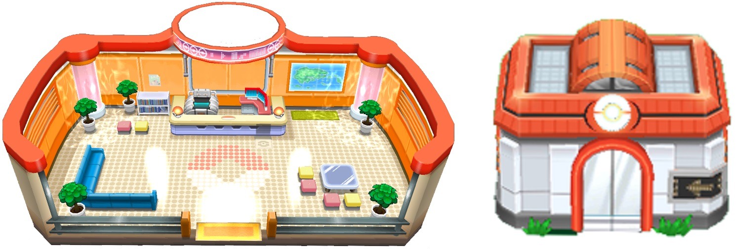Davanti all’ingresso troviamo l’infermiera con la macchina curatrice, la quale non si discosta quasi per niente da quella della generazione precedente. Accanto al PC, dove possiamo utilizzare il Sistema Memoria Pokémon sviluppato da Lanette, si trova una mappa consultabile della regione. Alla sinistra del bancone invece possiamo trovare uno scaffale con diverse riviste a tema Pokémon: “Amico Pokémon”, “Manuale Pokémon”, “Pokémon Adorabile”…