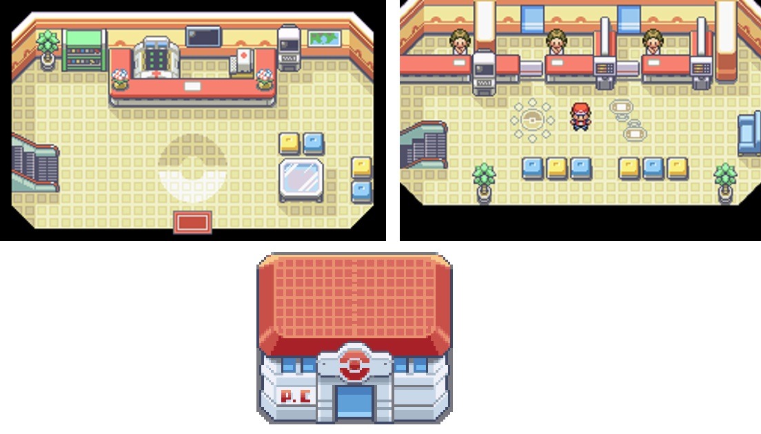 Il Centro Pokémon della regione di Kanto, nei giochi Pokémon Rosso, Blu e Giallo, era molto spartano, ma presentava tutte le comodità e i servizi che potesse desiderare un Allenatore dell’epoca. Subito davanti all’ingresso vi era il bancone con l’infermiera e la macchina che curava i nostri amici. In Pokémon Giallo potevamo trovare anche un Chansey come assistente alle operazioni di cura, proprio come nella Serie Animata. Un altro aspetto cruciale del Centro Pokémon era quello di poter trovare, completamente alla destra dell’ingresso, il PC con il quale si potevano depositare e ritirare i Pokémon grazie al sistema inventato da quel geniaccio di Bill (oltre a sfruttare l’utile glitch per la clonazione dei Pokémon, fonte di stress per il pulsante di accensione del povero Game Boy). Proprio davanti al PC si trovava invece il bancone del Club Via Cavo, dove ci si poteva collegare con altri giocatori per scambi o lotte tramite Cavo Game Link.