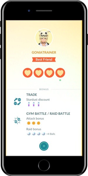È possibile aumentare il livello di amicizia con i propri amici giocandoci insieme per diversi giorni consecutivi. Per farlo dovrete inviare pacchi amicizia, partecipare a un raid o a una sfida in Palestra con degli amici così da aumentare il proprio livello di amicizia; a mano a mano che tale livello cresce verranno sbloccati dei bonus. È possibile aumentare il proprio livello di amicizia soltanto una volta al giorno per ogni amico.
