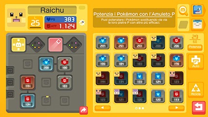 I Pokémon dell’Isola Cubetti hanno un livello che va da 1 a 100, un massimo di due mosse e solo due statistiche: Attacco e Difesa. La somma delle due statistiche indica il potenziale complessivo del Pokémon. Dopo ogni livello si otterranno delle Pietre P, speciali potenziamenti che permettono di incrementare le statistiche base del Pokémon, la velocità degli attacchi e altre caratteristiche. Ogni Pokémon avrà un Amuleto P con un massimo di 9 slot sbloccabili, salendo di livello, in cui inserire le Pietre P.