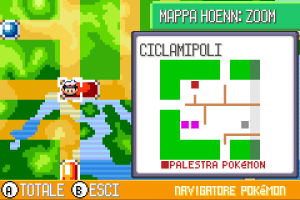 Mostra la mappa della regione di Hoenn. È possibile ingrandire la mappa per ricevere informazioni sulle singole città e conoscere la posizione del Centro Pokémon, il Pokémon Market, la Palestra e l’Arena delle Virtù.